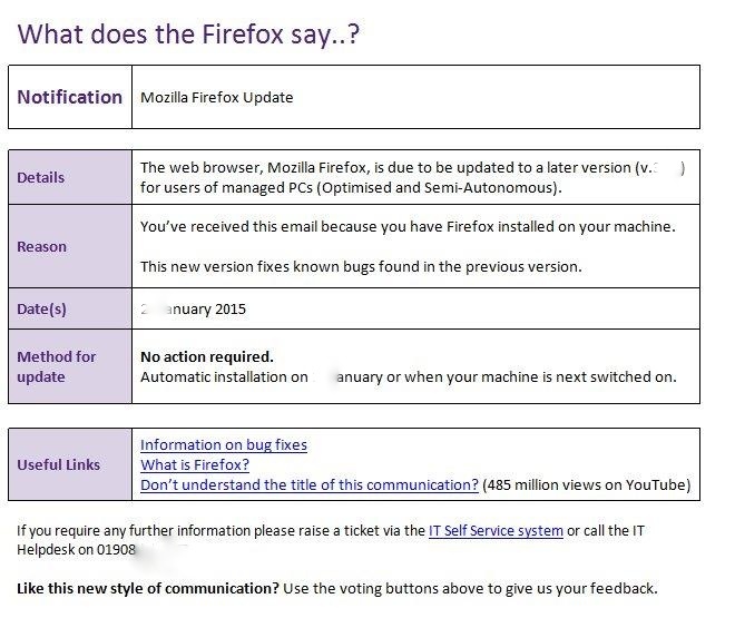 Do you wonder about how to get staff reading boring IT announcements? This is the title of the note about our latest Firefox browser update. No, I didn’t get it either; my new IT service comms person had to explain it to me – click on the picture for an explanation – 489 million youtube hits! A different world.